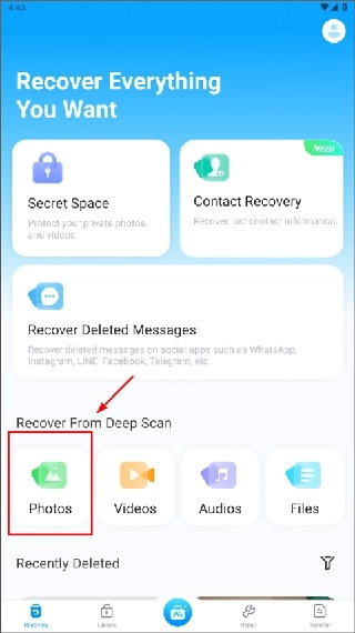 1. 启动Dr.Fone安卓版应用,点击界面下方的“Photos”选项;