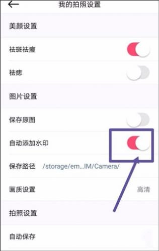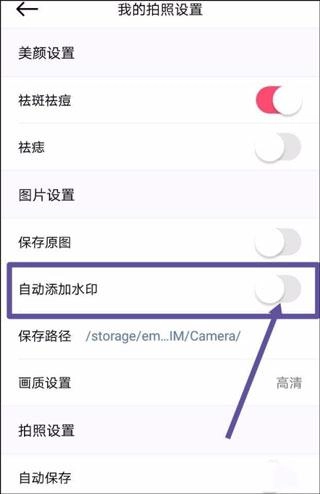 4、接着我们就能看到“自动添加水印”的选项,这里需要说明一下:这些水印都是相机自带的,无法由用户自行重新设置。
