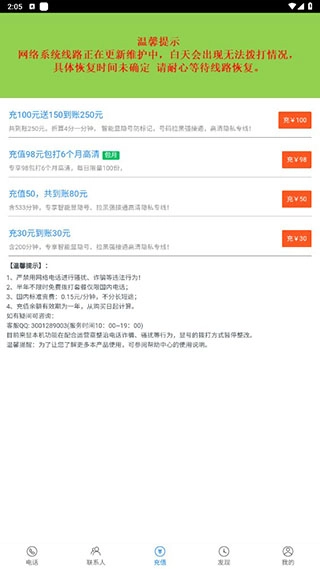 5、充值操作:点击屏幕底部的充值图标即可进入充值页面,在此可挑选不同的充值档位,充值金额越高,获赠的话费就越多。