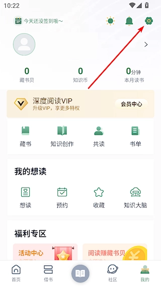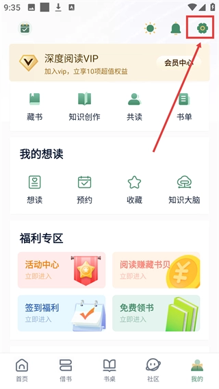 1、打开藏书馆,进入“我的”界面,点击右上角的齿轮按钮