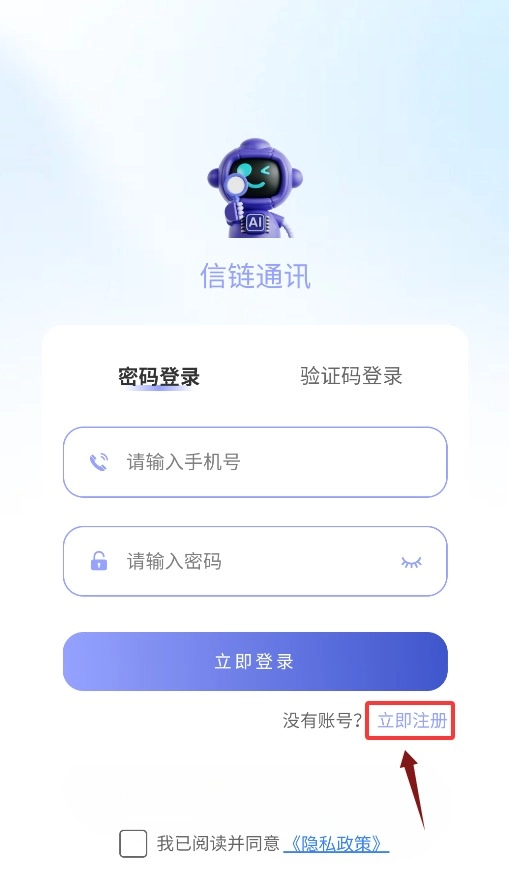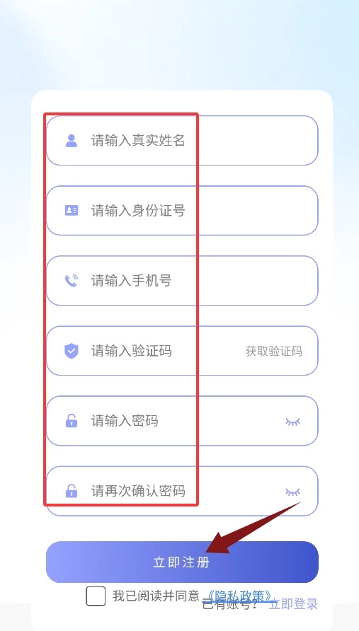 2、在登录页点击“立即注册”按钮,即可进入账号创建页面。