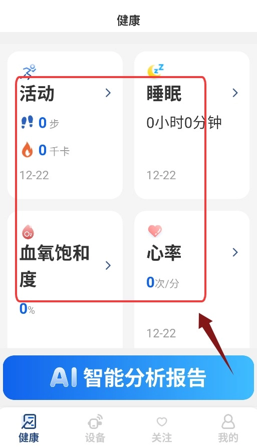 2、健康界面可查看活动量、睡眠质量、血氧饱和度与心率数据。