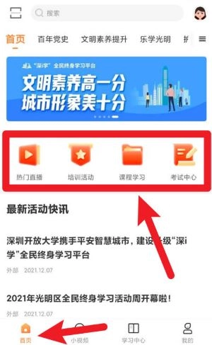 1、打开首页后可浏览最新活动、课程分类及热门直播,点击图标即可进入对应学习或活动内容。