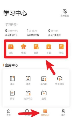 2、进入学习中心后,可查看已购课程、收藏、订阅和笔记,点击相应模块即可开始学习或管理内容。