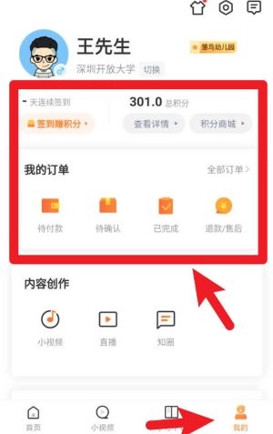 3、点击我的页面可查看积分、订单及内容创作入口,支持上传小视频、直播和知识图文等内容。