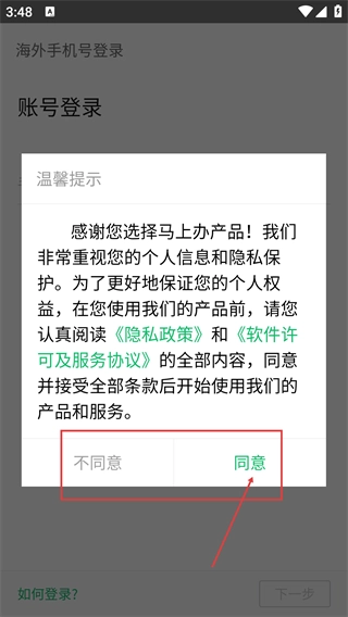 1、进入【马上办产品】后弹出温馨提示,需阅读【隐私政策】和【软件许可及服务协议】,点击【同意】按钮以继续使用产品及服务。