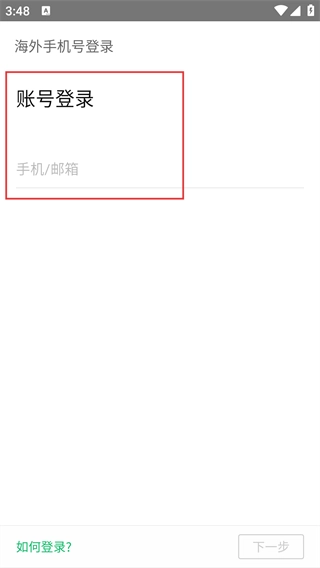 2、进入【账号登录】页面,可在【手机/邮箱】输入框填写信息,也可选择页面顶部的【海外手机号登录】方式进行登录。