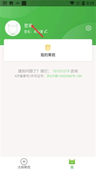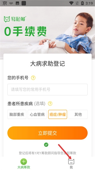 1、进入大病求助登记界面,点击底部【我】进入“我”的页面。