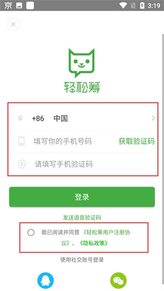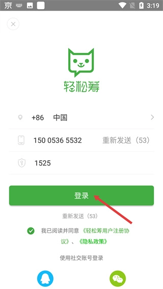 4、在登录界面填写【手机号码】和【验证码】,检查并确认协议已勾选后,点击【登录】按钮即可完成账号登录操作。