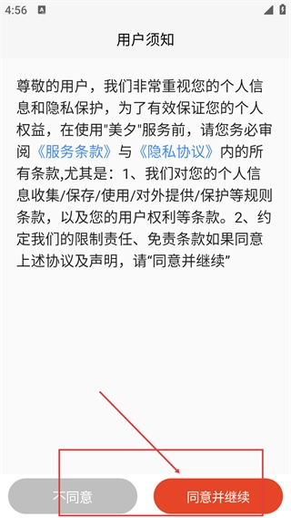 1、进入【用户须知】页面后,需先仔细阅读并了解【服务条款】和【隐私协议】的内容,在确认认可相关规则后,点击【同意并继续】按钮,才能进入到后续的操作流程中。