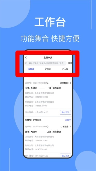 2、进入工作台后,可通过顶部搜索栏输入订单编号或车辆信息,快速查找相关物流记录与状态。