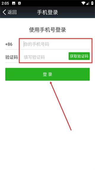 2、进入【手机登录】界面后,在“你的手机号码”输入框中填写对应的号码,输入验证码,然后点击【登录】按钮,即可完成账号登录操作。
