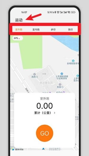 2、登录后点击运动选项,选择室外跑、步行等项目,并开启GPS定位开始记录。