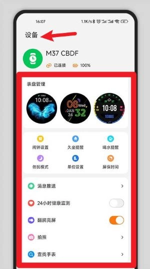 3、点击底部的设备选项卡后,就能查看已连接的手环信息,还能进入表盘与提醒的设置页面。