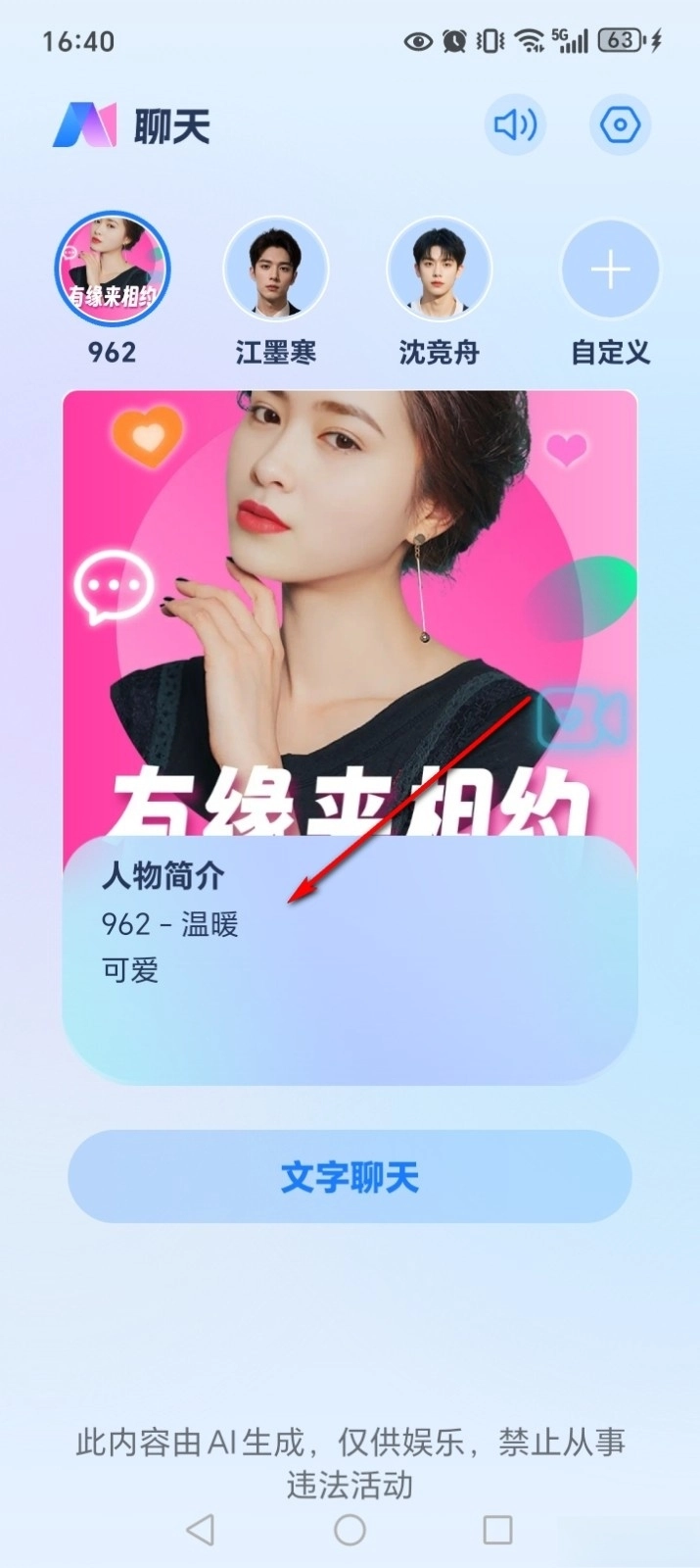 《AI语音通话》是合肥莫寒科技有限公司推出的一款支持AI文字聊天与语音聊天的智能软件,软件自带了几个AI角色,玩家可以与这些AI角色互动,当然你也可以自己来创建一个AI角色,只需要添加照片、昵称和描写性格即可一键生成AI角色,可以与之聊天互动。