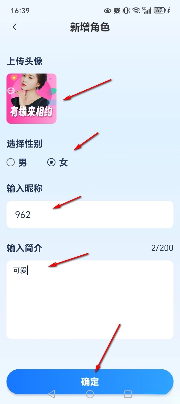 上传头像,选择性别,输入昵称,输入简介,点击【确定】