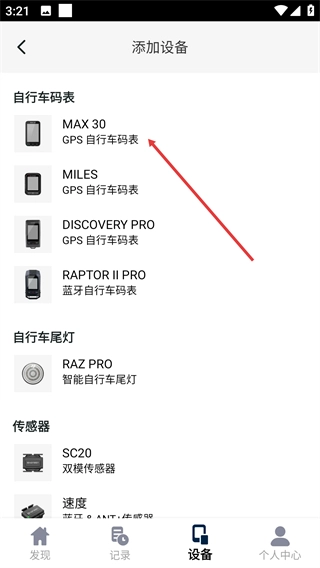 3、在添加设备页选择对应品类下的设备(如【MAX-30-GPS自行车码表】),可进入该设备的绑定流程,拓展训练数据采集维度。