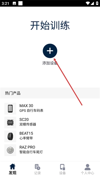 2、在开始训练页点击【添加设备】按钮,可进入设备选择界面,该界面展示热门运动设备,支持绑定硬件辅助训练。