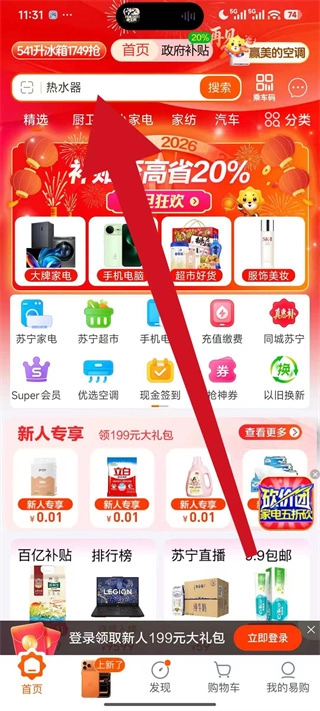 1、打开苏宁易购,在首页搜索栏点击顶部搜索框,进入搜索界面。