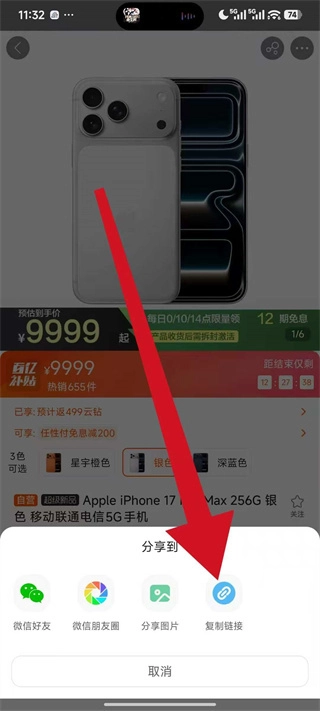 4、在商品详情页的右上角点击分享图标,弹出分享到的选项菜单。