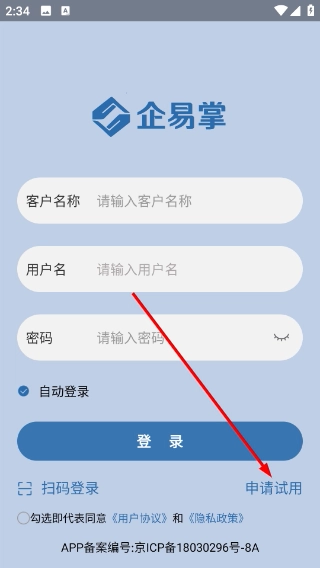 1、在企易掌登录页面,点击【申请试用】,开始申请步骤。