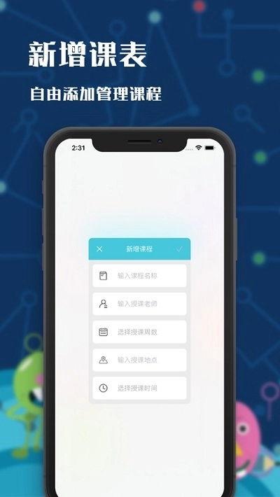 【详细】上课时间、授课老师、上课地点清晰展示 【自定义】课表导入后可自行添加课程,蹭课更便捷