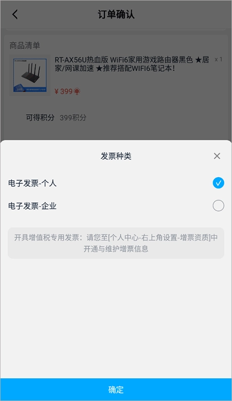 1、在订单确认界面点击“添加发票”一栏。