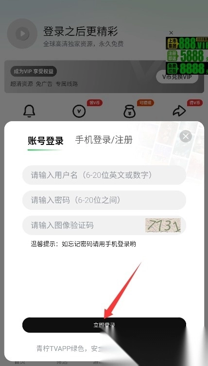 1、启动青柠TV应用程序,输入已完成注册的账号、密码以及验证码,点击登录按钮进入系统;
