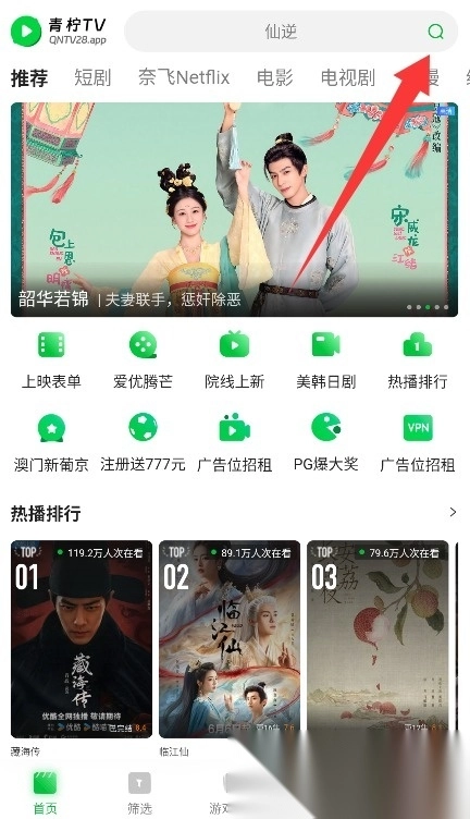 2、在主界面顶部的搜索框中输入你想要观看的影视名称,然后从搜索结果里挑选对应的内容并进入其详情页面;