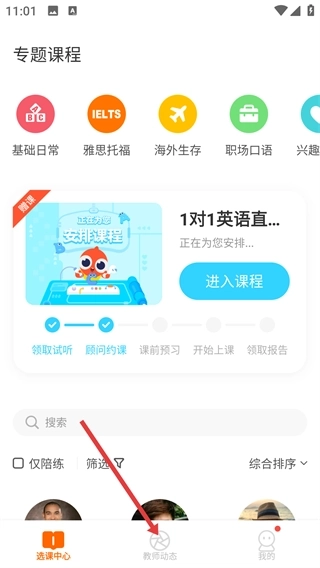 1、在【专题课程】的【选课中心】页面,点击底部的【教师动态】选项,进入教师发布内容的展示页面。