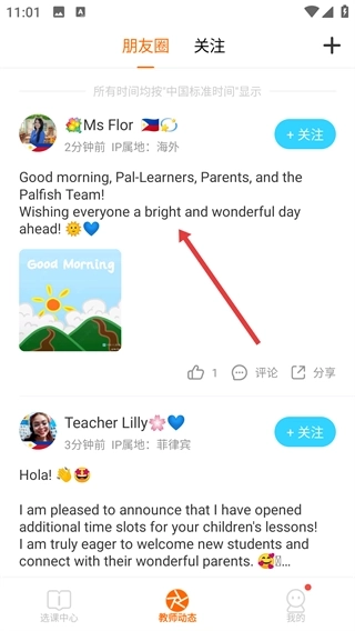 2、进入【教师动态】中的【朋友圈】页面,查看Ms-Flor等老师发布的动态内容,可执行关注等互动操作。
