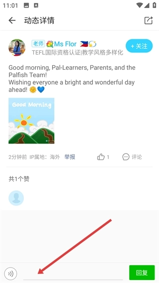 3、点击老师发布的动态内容,进入【动态详情】页面后,找到评论输入框,即可准备开展评论互动。