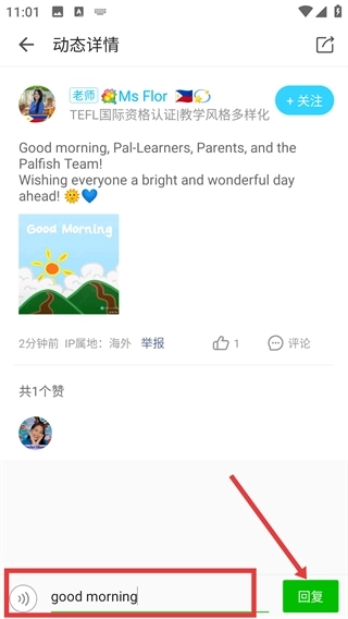 4、在【动态详情】的评论输入框中填写【good-morning】,随后点击【回复】按钮,即可完成评论的发布操作。