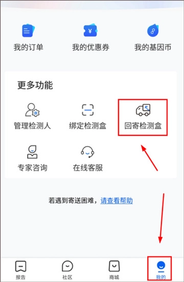 打开【基因宝App】后,进入【我的】页面,找到【回寄唾液盒】选项,点击该页面即可一键预约快递,享受免费上门取件服务。