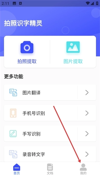1、点击界面底部的【我的】选项,即可进入个人中心页面,在此页面也能查看首页的【拍照提取】【图片提取】等功能。