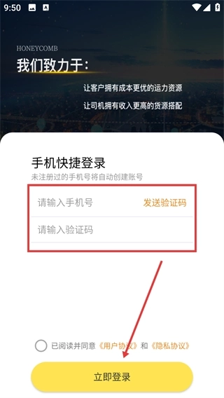 1、在登录界面,输入手机号和验证码后,进行登录。