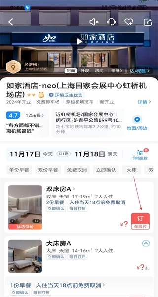 3、选定如家酒店neo上海国家会展中心虹桥机场店,在查看该酒店的评分、开业时间、房型等相关信息后,点击“订在线付”选项。