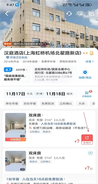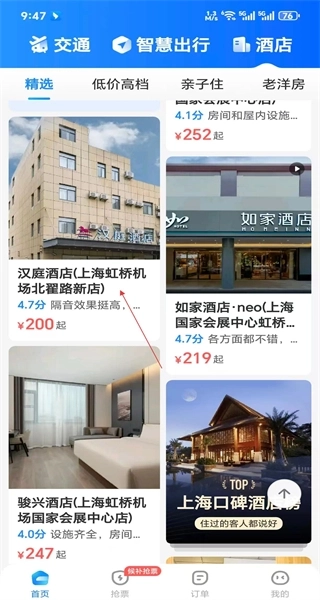 1、在酒店列表里挑选汉庭酒店上海虹桥机场北翟路新店,查看该酒店的评分、价格、具体位置以及用户评价等相关信息。