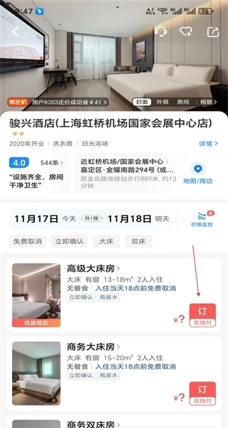 4、选择骏兴酒店上海虹桥机场国家会展中心店,查看其评分、设施、房型等信息后,点击在线付预订。