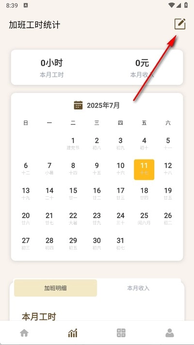 1、打开软件进入主页,点击下方加班统计;