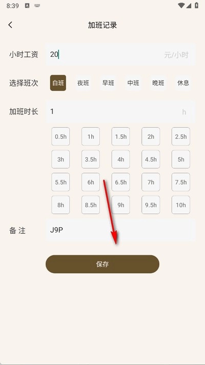 3、输入小时工资、班次、加班时长后点击保存即可。