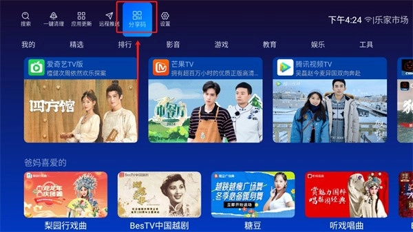 1、打开乐家市场TV版后,在首页能看到精选、排行、影音、直播、教育、游戏、工具等诸多模块。