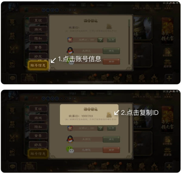 在账号信息页面找到自己的ID并复制下来,接着到三国咸话里把复制好的ID填写进去。