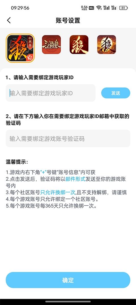 请输入需要绑定的游戏ID,然后通过验证码来确认该账号的绑定操作。