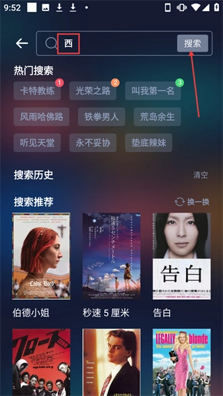 2、在搜索页面的输入框中填入“西”字,接着点击输入框右侧的搜索按钮,就能触发搜索功能。