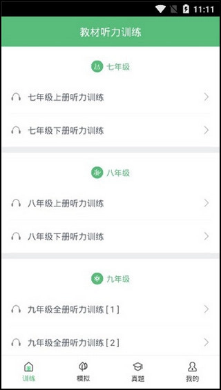 打开应用后,映入眼帘的首要功能便是教材听力训练,覆盖了初中七年级到九年级的内容,做得十分详尽。