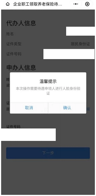 进入申办人信息页面后,若选择“本人办理”的办理方式,需仔细核对申办人信息,确认无误后点击【下一步】按钮;若选择“为他人办理”的办理方式,则要先核对代办人信息,再在申办人信息模块中准确录入需办理企业职工领取养老保险待遇资格认证人员的姓名、证件类型及证件号码,核对所有信息无误后,点击【下一步】按钮即可。