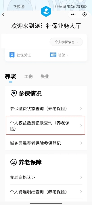 登录后,在首页向下滑动页面找到“社保”板块,点击进入该板块;随后,在养老、工伤、失业这三个分类中的任意一个分类下方,选择“个人权益缴费记录查询”选项即可。