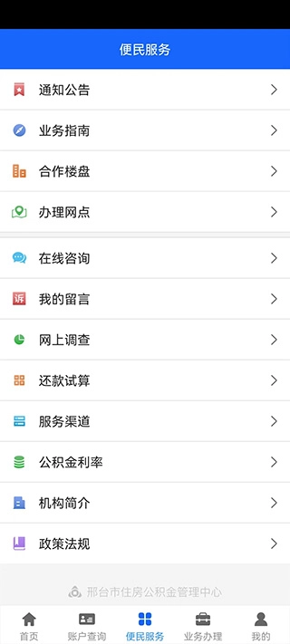 便民服务涵盖多种类型,像政策告知、合作房产项目、业务办理地点、住房公积金相关利率等,始终致力于为大家提供高质量的服务内容。