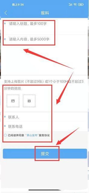 进入报料界面后,您需要填写标题与内容描述,完成图片或视频的上传,并提供联系人姓名及联系电话。之后,请仔细阅读并勾选同意“萧山发布”服务协议,最后点击【提交】按钮即可。